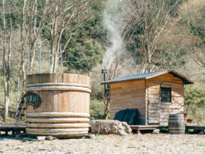 キャンプ場には薪で沸かす貸切露天風呂がついていて、そちらに水を張って水風呂として利用できます。